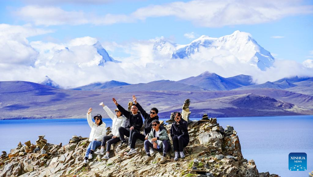 Tourists pose for photos by the Puma Yumco Lake in Nagarze County of Shannan, southwest China's Tibet Autonomous Region, July 4, 2023. (Xinhua/Chen Shangcai)