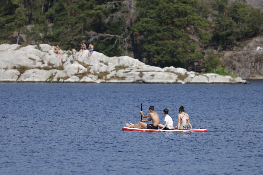 People spend time on a lake during a heatwave in Stockholm, Sweden, on July 21, 2022. (Photo by Wei Xuechao/Xinhua)