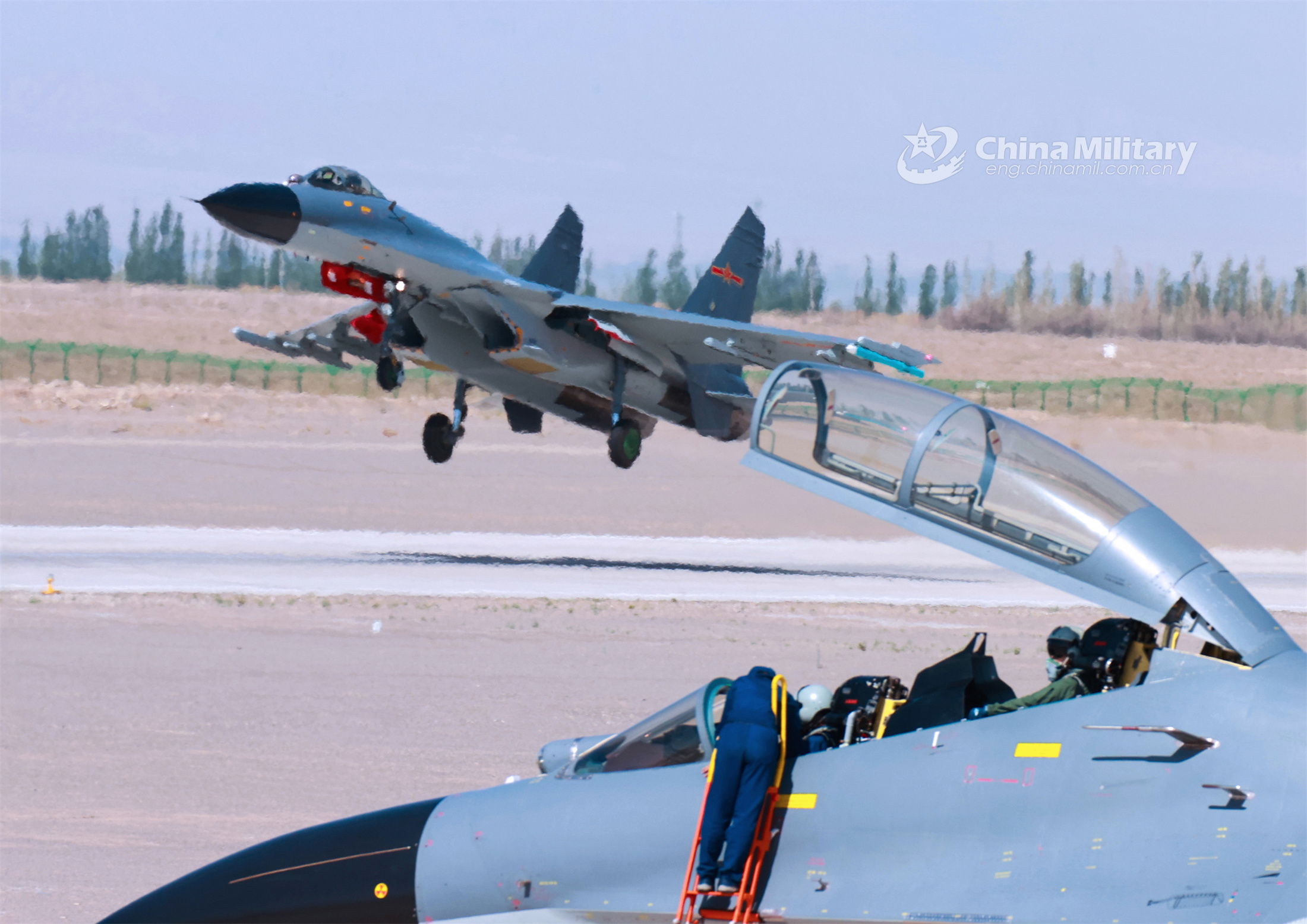 A maintenance member assigned to a brigade under the PLA Air Force Xi'an Flight Academy conducts pre-flight check on a fighter jet before a flight training exercise on June 13, 2023. (eng.chinamil.com.cn/Photo by Cui Baoliang)