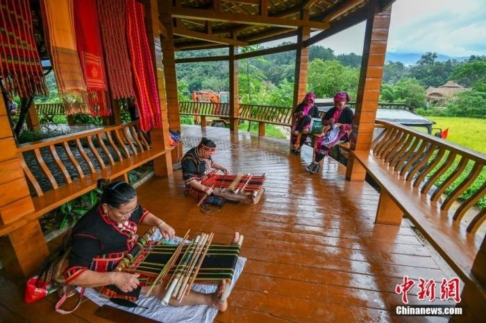 Women of Li and Miao ethnic groups weave and do needlework in Maona village, Shuiman township, south China's Hainan Province, on June 29, 2023. (China News Service/Luo Yunfei)