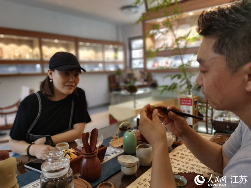 A fruit pit carving artist (right) creates a piece of work. (People's Daily Online/Wang Jiliang)