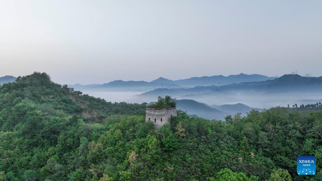 This aerial photo taken on July 5, 2023 shows the Dongjiakou Great Wall shrouded in fog in Qianxi County of Tangshan, north China's Hebei Province. (Photo by Wang Aijun/Xinhua)