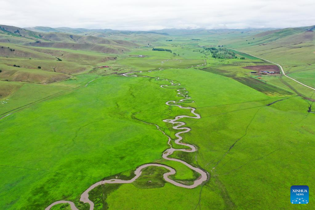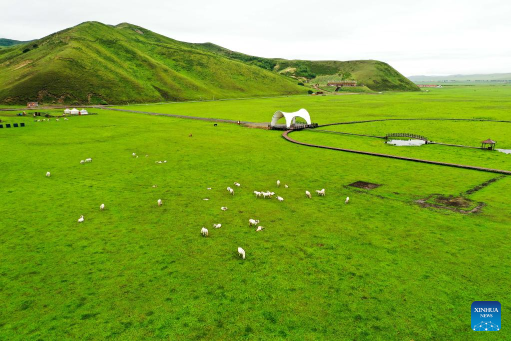 This aerial photo taken on July 5, 2023 shows the summer scenery of the Ulan Mod grassland in Horqin Right Wing Front Banner of Hinggan League, north China's Inner Mongolia Autonomous Region. (Xinhua/Bei He)