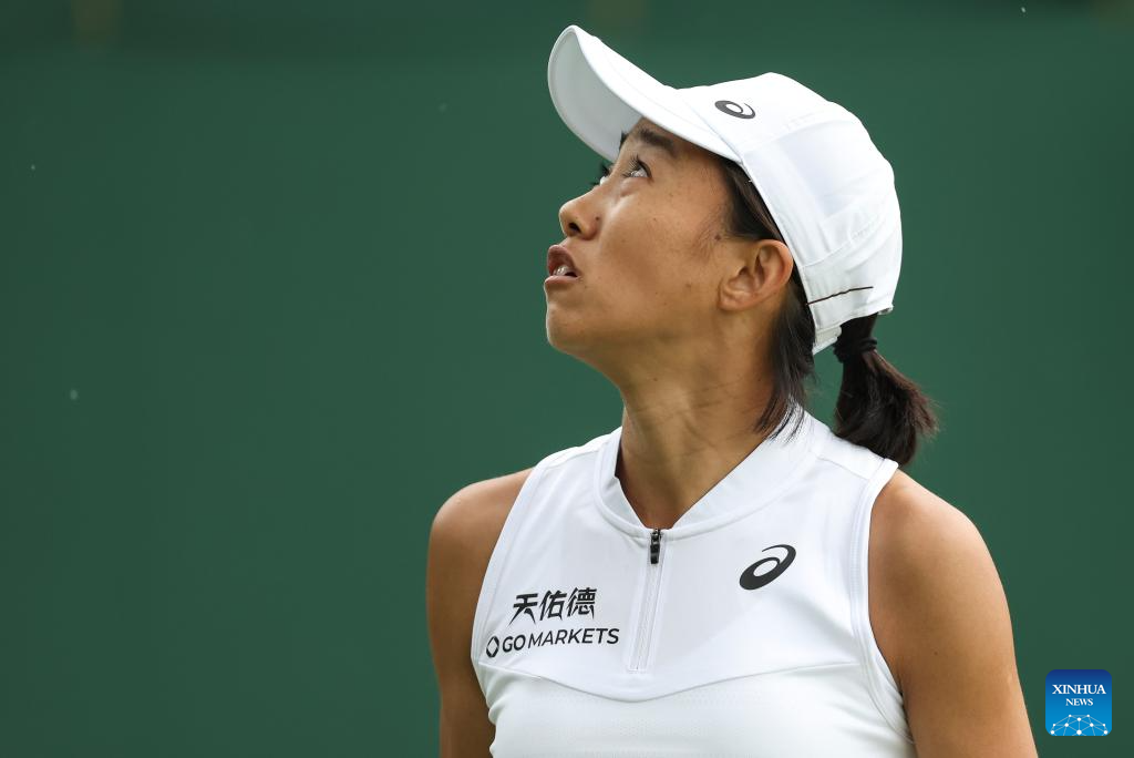 Zhang Shuai looks up during the women's singles first round match between Zhang Shuai of China and Donna Vekic of Croatia at Wimbledon Tennis Championships in London, Britain, July 5, 2023. (Xinhua/Han Yan)