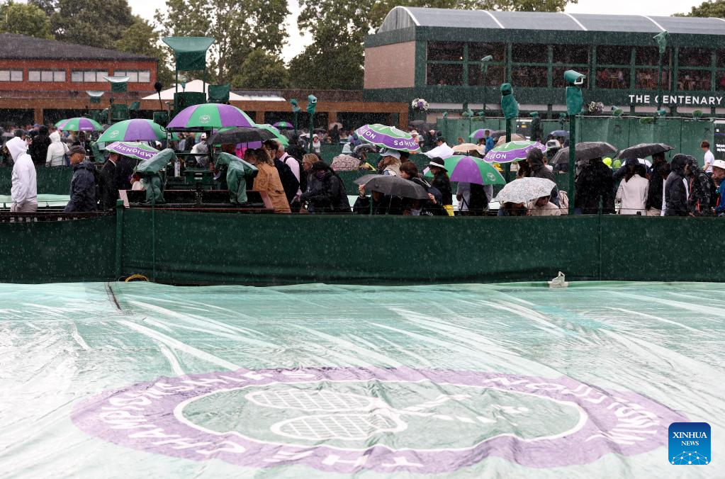 People leave the court for the rain delay during the women's singles first round match between Zhang Shuai of China and Donna Vekic of Croatia at Wimbledon Tennis Championships in London, Britain, July 5, 2023. (Xinhua/Han Yan)