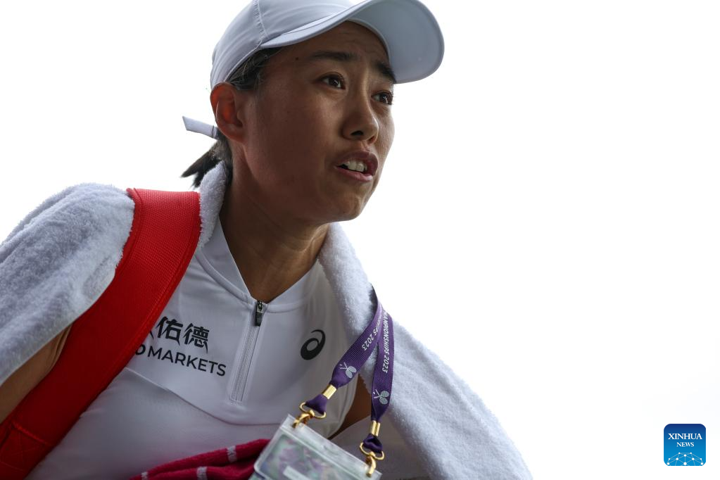 Zhang Shuai leaves the court after the match being suspended due to rain during the women's singles first round match between Zhang Shuai of China and Donna Vekic of Croatia at Wimbledon Tennis Championships in London, Britain, July 5, 2023. (Xinhua/Han Yan)