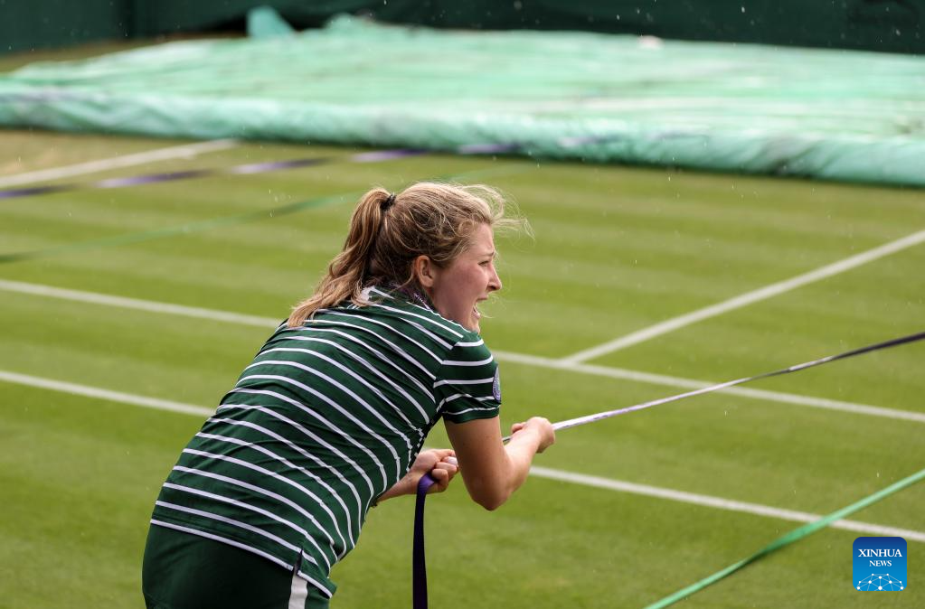 A ground staff pulls the rain cover to protect the grass court at the beginning of the rain delay during the women's singles first round match between Zhang Shuai of China and Donna Vekic of Croatia at Wimbledon Tennis Championships in London, Britain, July 5, 2023. (Xinhua/Han Yan)