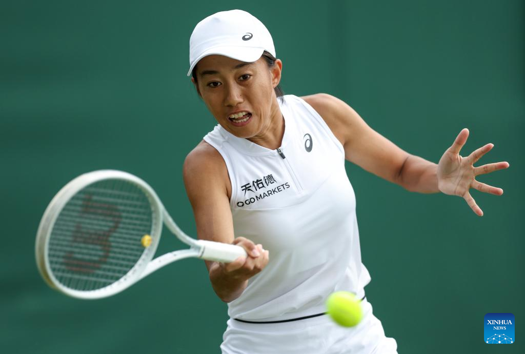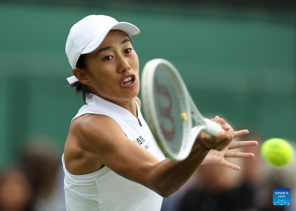 Zhang Shuai hits a return during the women's singles first round match between Zhang Shuai of China and Donna Vekic of Croatia at Wimbledon Tennis Championships in London, Britain, July 5, 2023. (Xinhua/Han Yan)