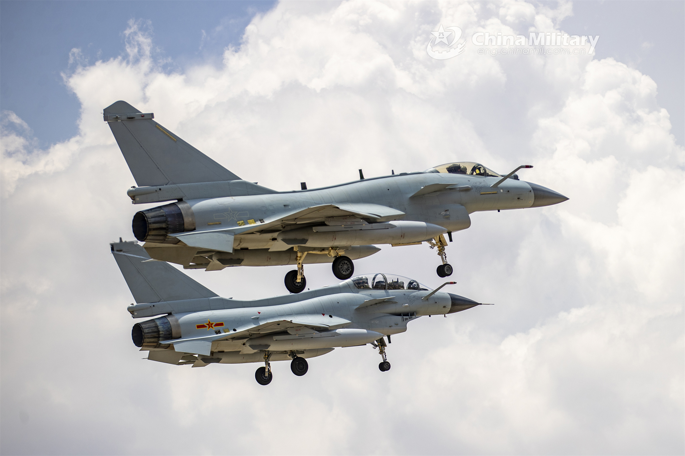 Two J-10 fighter jets attached to an aviation brigade of the air force under the PLA Southern Theater Command fly together at the same altitude during a recent flight training exercise. (eng.chinamil.com.cn/Photo by Wang Guoyun)
