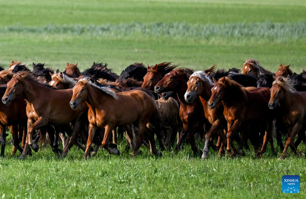 This photo taken on July 5, 2023 shows horses running on the grassland in Holin Gol, north China's Inner Mongolia Autonomous Region. The picturesque grassland in Holin Gol, located at the intersection of Horqin Grassland, Xilin Gol Grassland and Hulunbuir Grassland, is one of the primitive grasslands in Inner Mongolia Autonomous Region. (Xinhua/Lian Zhen)