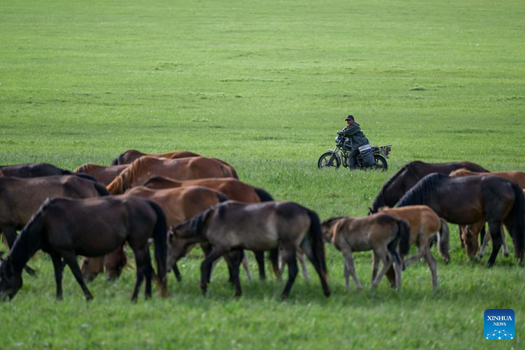 This photo taken on July 5, 2023 shows a herdsman herding horses on the grassland in Holin Gol, north China's Inner Mongolia Autonomous Region. The picturesque grassland in Holin Gol, located at the intersection of Horqin Grassland, Xilin Gol Grassland and Hulunbuir Grassland, is one of the primitive grasslands in Inner Mongolia Autonomous Region. (Xinhua/Lian Zhen)