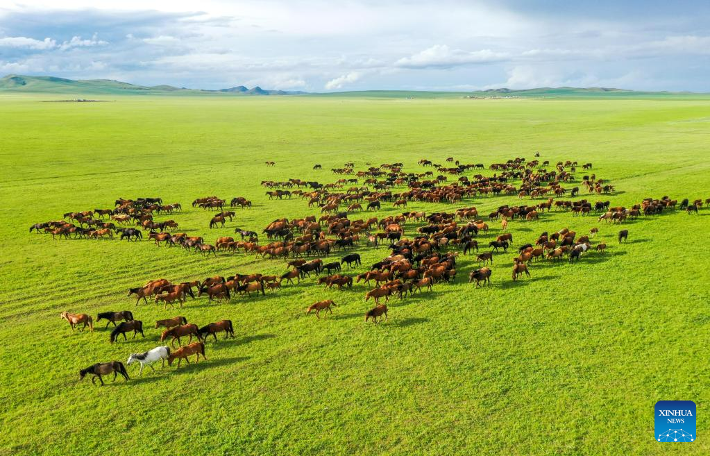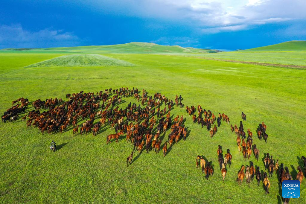 This photo taken on July 5, 2023 shows horses on the grassland in Holin Gol, north China's Inner Mongolia Autonomous Region. The picturesque grassland in Holin Gol, located at the intersection of Horqin Grassland, Xilin Gol Grassland and Hulunbuir Grassland, is one of the primitive grasslands in Inner Mongolia Autonomous Region. (Xinhua/Lian Zhen)