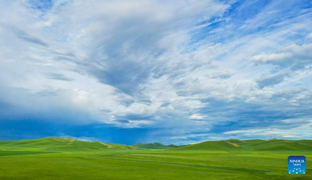 This photo taken on July 5, 2023 shows the scenery of the grassland in Holin Gol, north China's Inner Mongolia Autonomous Region. The picturesque grassland in Holin Gol, located at the intersection of Horqin Grassland, Xilin Gol Grassland and Hulunbuir Grassland, is one of the primitive grasslands in Inner Mongolia Autonomous Region. (Xinhua/Lian Zhen)