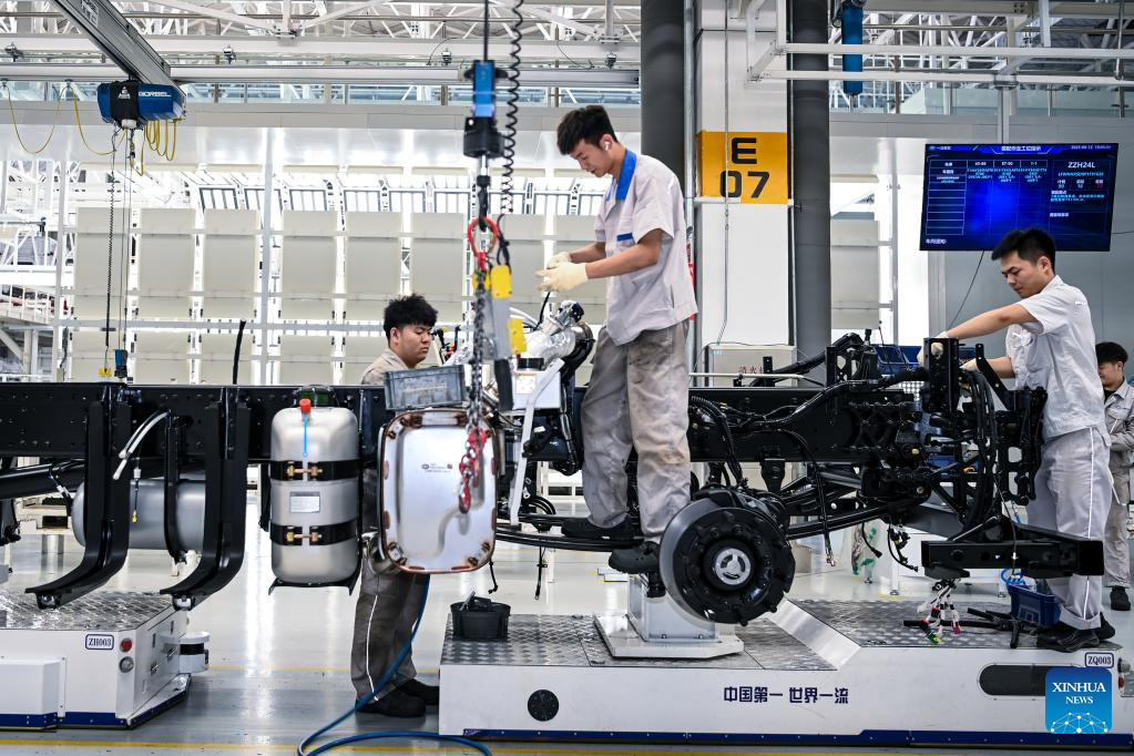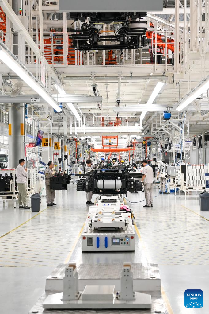 This photo taken on June 12, 2023 shows workers assembling automobiles at an intelligent plant of truck manufacturer First Automotive Works Jiefang Co., Ltd. (FAW Jiefang) in Changchun, northeast China's Jilin Province. (Xinhua/Yan Linyun)
