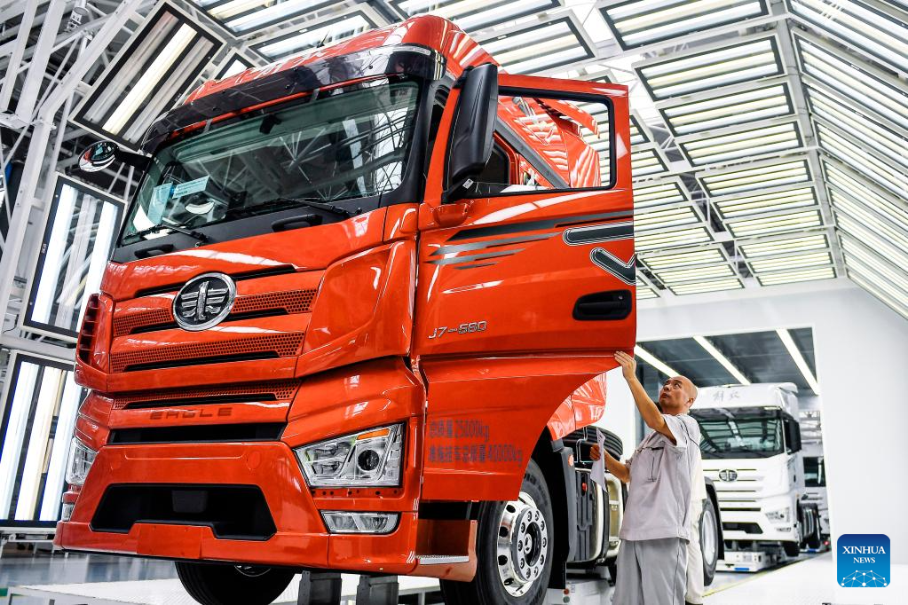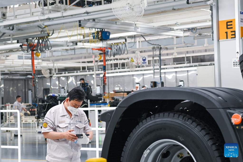 This photo taken on June 27, 2023 shows a worker checking an assembled truck at an intelligent plant of truck manufacturer First Automotive Works Jiefang Co., Ltd. (FAW Jiefang) in Changchun, northeast China's Jilin Province. (Xinhua/Xu Chang)