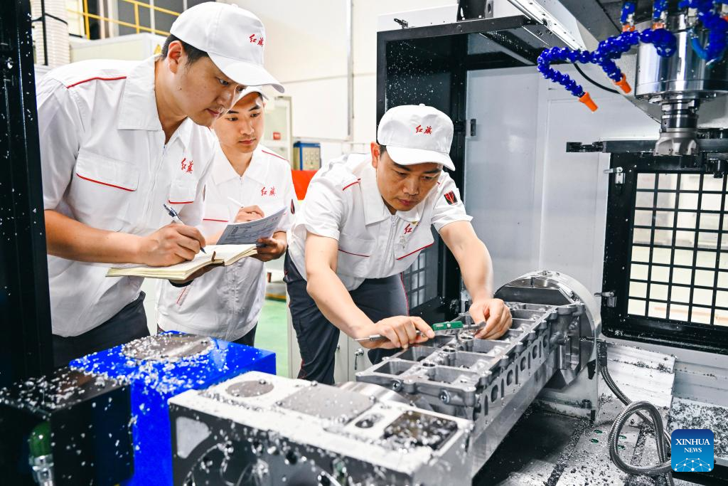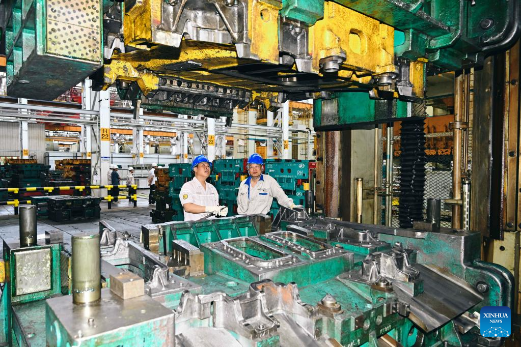 This photo taken on June 8, 2023 shows bench worker Feng Bin (L) checking the working condition of a punching machine at a plant of truck manufacturer First Automotive Works Jiefang Co., Ltd. (FAW Jiefang) in Changchun, northeast China's Jilin Province. Feng is a model worker with over twenty years of experience. (Xinhua/Xu Chang)