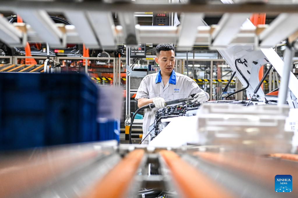 This photo taken on June 12, 2023 shows a worker assembling vehicles at the general assembly line of FAW-Volkswagen in Changchun, northeast China's Jilin Province. (Xinhua/Yan Linyun)