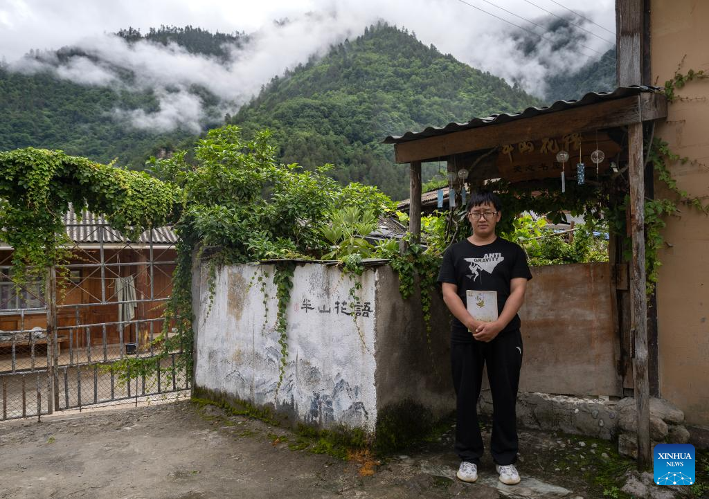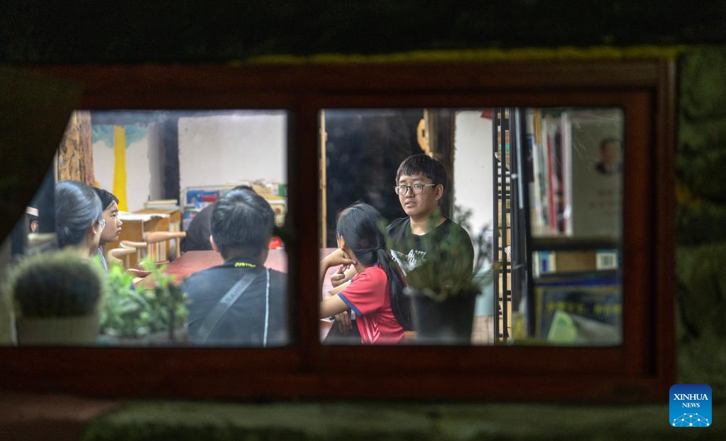 Gan Wenyong is pictured at the "Banshan Huayu" library in Qiunatong Village of Bingzhongluo Township in Gongshan Dulong and Nu Autonomous County, Lisu Autonomous Prefecture of Nujiang, southwest China's Yunnan Province, July 6, 2023. (Xinhua/Fei Maohua)
