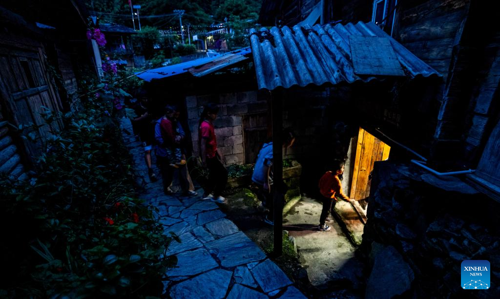 Children enter the "Banshan Huayu" library in Qiunatong Village of Bingzhongluo Township in Gongshan Dulong and Nu Autonomous County, Lisu Autonomous Prefecture of Nujiang, southwest China's Yunnan Province, July 5, 2023. (Xinhua/Jiang Wenyao)