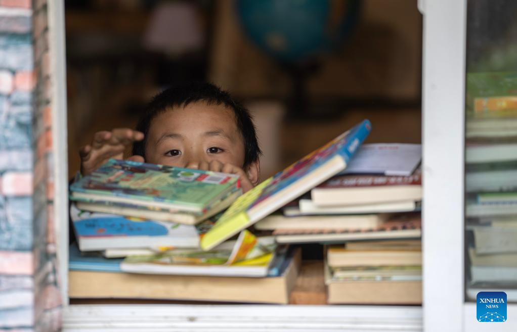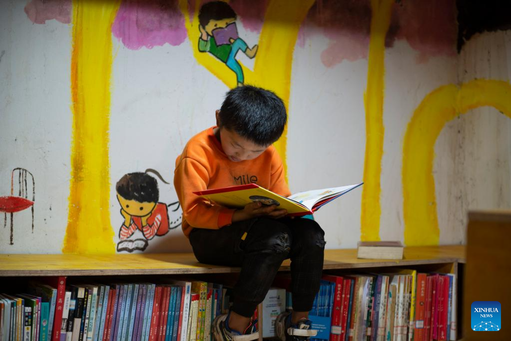 A child reads a book at the "Banshan Huayu" library in Qiunatong Village of Bingzhongluo Township in Gongshan Dulong and Nu Autonomous County, Lisu Autonomous Prefecture of Nujiang, southwest China's Yunnan Province, July 5, 2023. (Xinhua/Xu Jiayi)