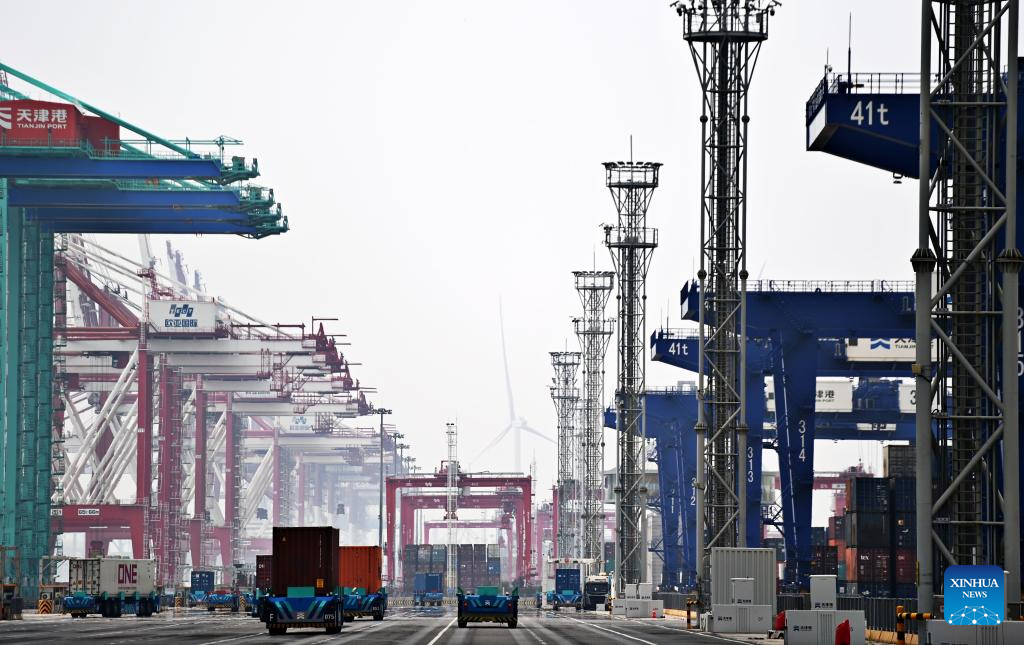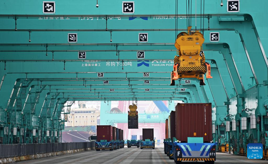Photo taken on July 7, 2023 shows robots transferring containers at Tianjin Port in north China's Tianjin. (Xinhua/Zhao Zishuo)