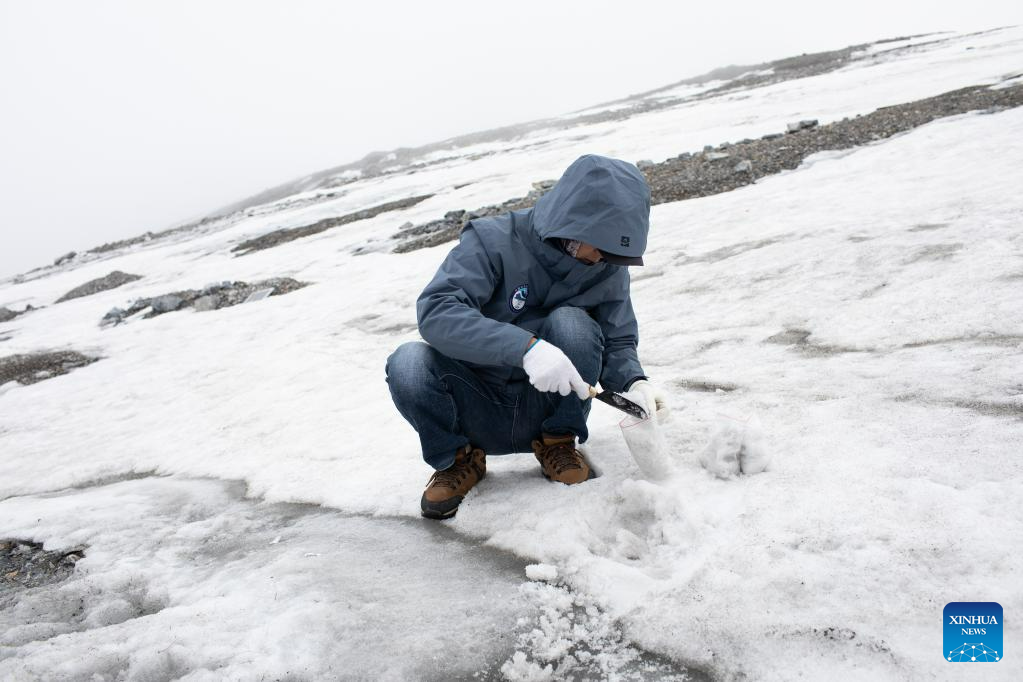 Du Chunhong, a researcher with Yulong Snow Mountain Cryosphere and Sustainable Development Field Science Observation and Research Station, takes a snow sample on the Baishui River No. 1 Glacier on the Yulong Snow Mountain in Lijiang City, southwest China's Yunnan Province, June 19, 2023. (Xinhua/Jin Liwang)