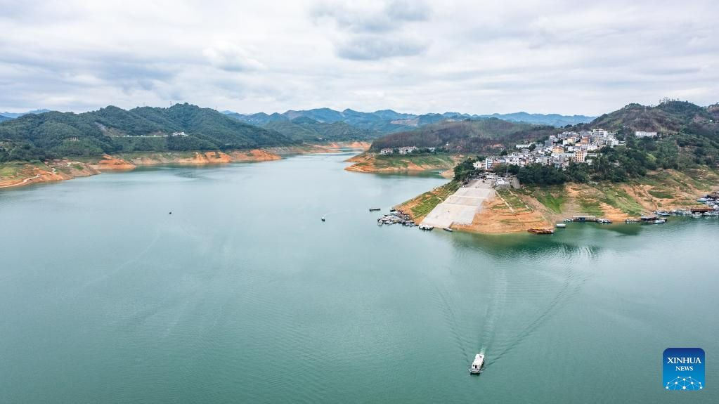 This aerial photo taken on July 4, 2023 shows a boat sailing on Wanfeng Lake in Nanpan river town of Xingyi City in southwest China's Guizhou Province. Covering an area of 176 square kilometer, the Wanfeng Lake serves as an important ecological barrier to Pearl River Delta region. The local authority has taken proactive measures to tackle pollution and improve the water quality here. (Xinhua/Tao Liang)