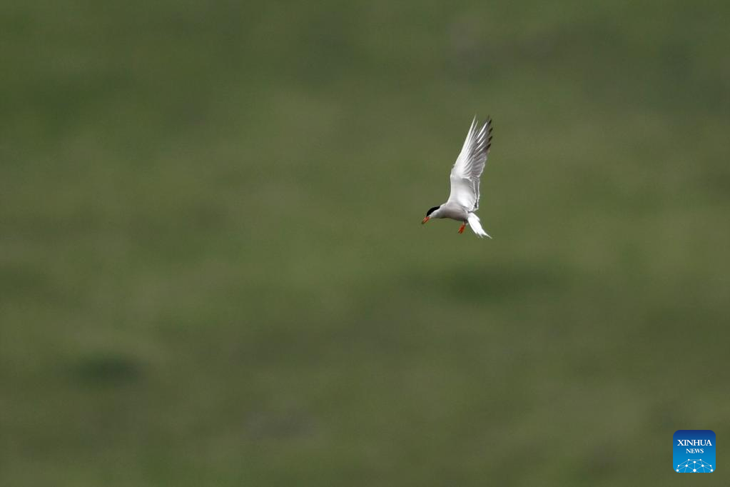 A tern is pictured in the Gahai Lake wetland in Luqu County of the Tibetan Autonomous Prefecture of Gannan, northwest China's Gansu Province, July 7, 2023. (Xinhua/Chen Bin)