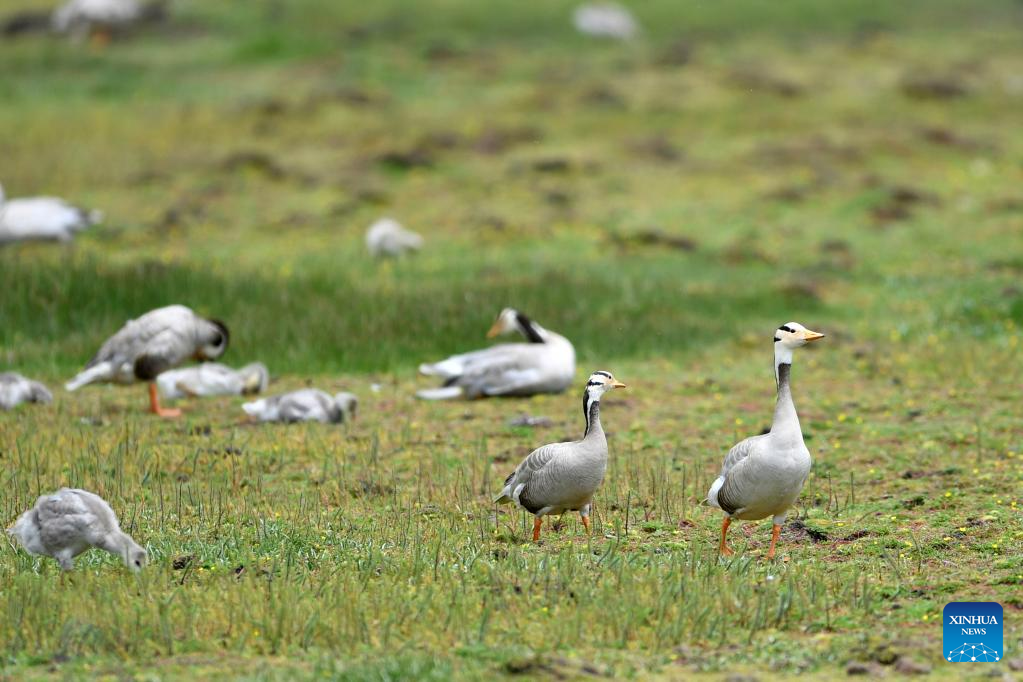 Bar-headed geese are pictured in the Gahai Lake wetland in Luqu County of the Tibetan Autonomous Prefecture of Gannan, northwest China's Gansu Province, July 7, 2023. (Xinhua/Zhang Keren)
