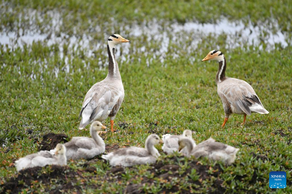 Chicks of bar-headed goose are pictured in the Gahai Lake wetland in Luqu County of the Tibetan Autonomous Prefecture of Gannan, northwest China's Gansu Province, July 7, 2023. (Xinhua/Chen Bin)