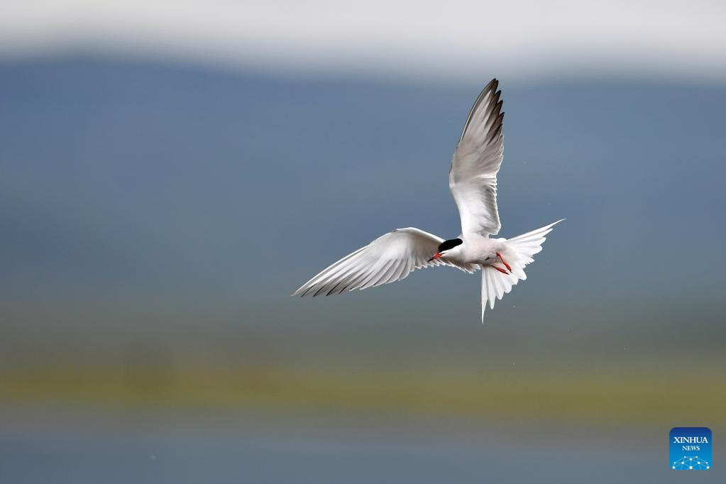 A tern flies over the Gahai Lake wetland in Luqu County of the Tibetan Autonomous Prefecture of Gannan, northwest China's Gansu Province, July 7, 2023. (Xinhua/Zhang Keren)