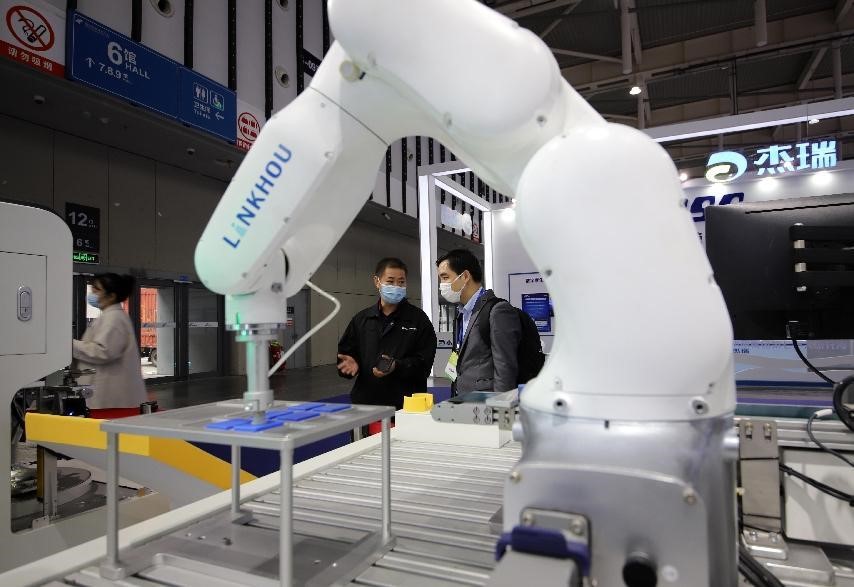 A robot teaching platform is exhibited at the 2022 China (Nanjing) International Software Product and Information Service Expo held in Nanjing, east China's Jiangsu province, Nov. 23, 2022. (People's Daily Online/Li Wenbao)