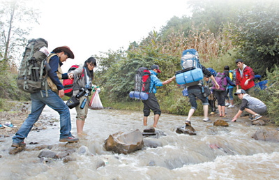 Members of the photography team of Guizhou Normal University cross a river on their way to a village in southwest China's Guizhou Province. (Photo courtesy of the photography team of Guizhou Normal University)