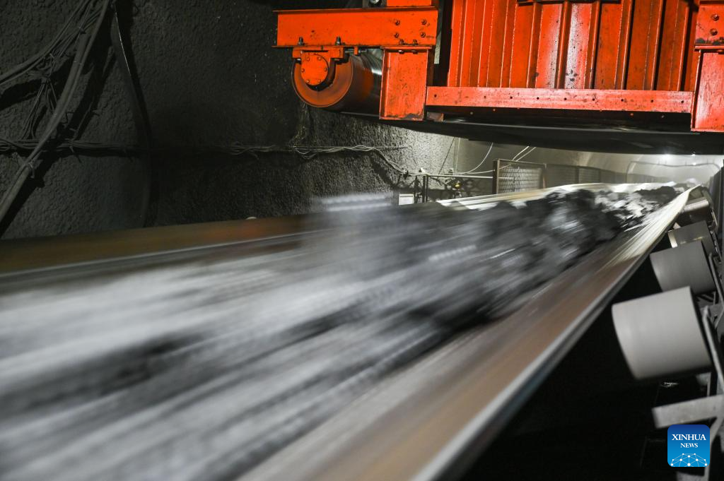 Coal is transported to the overground coal storage facility at the Longwanggou Coal Mine of China Datang Corporation Ltd. in Jungar Banner, north China's Inner Mongolia Autonomous Region, July 8, 2023. (Xinhua/Liu Lei)