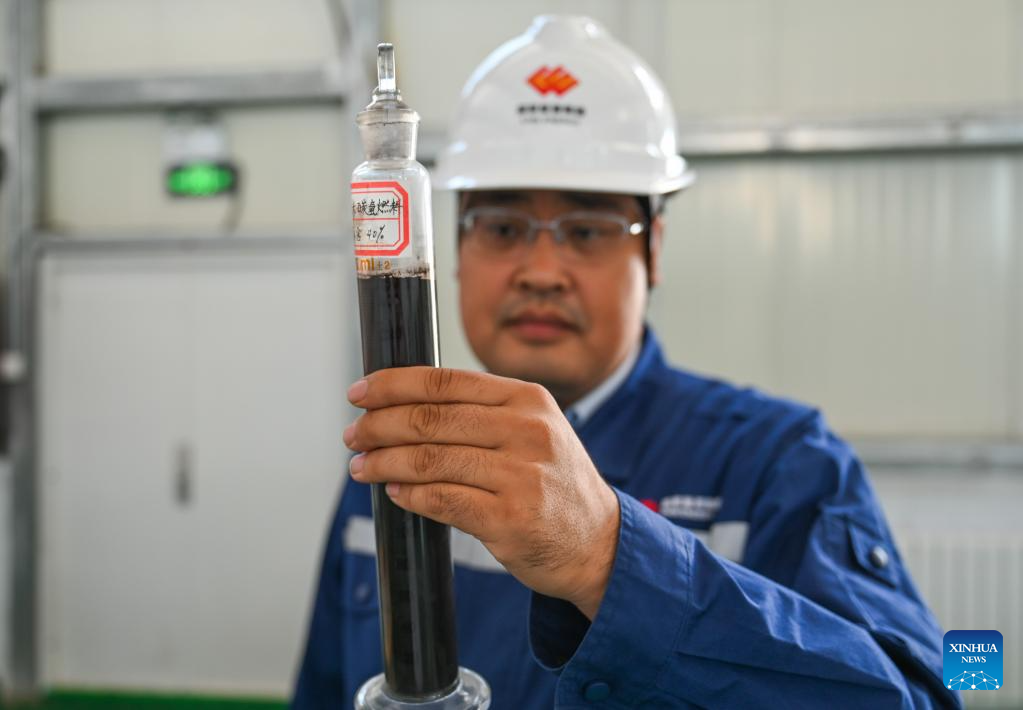 Zhen Peng, head of a workshop of CHN Energy, displays a sample of a new type of coal-based hydrocarbon fuel in Jungar Banner, north China's Inner Mongolia Autonomous Region, July 7, 2023. (Xinhua/Liu Lei)
