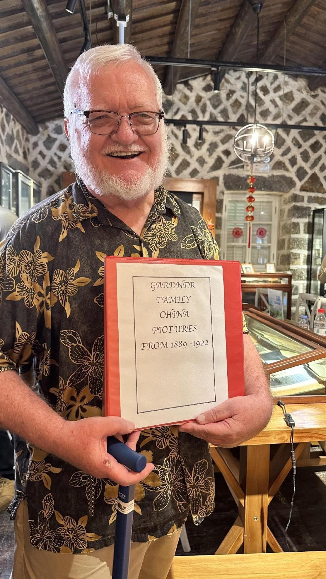 Lee Garnder holds a photo album that records his family's bond with Kuliang. (People's Daily/Wang Yinxin)