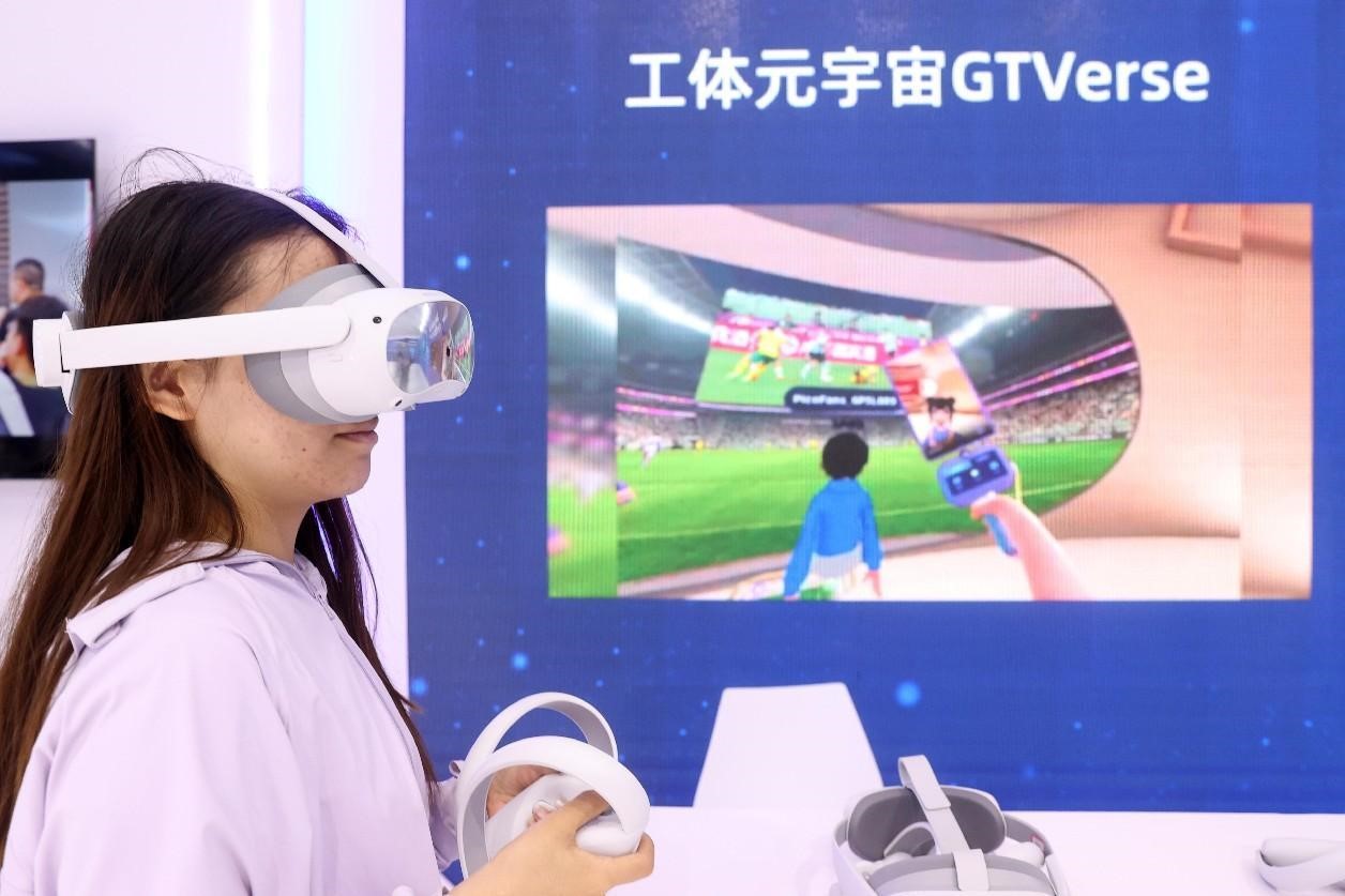 A woman experiences the metaverse wearing a virtual reality headset at the Global Digital Economy Conference 2023 in Beijing, July 4, 2023. (People's Daily Online/Chen Xiaogen)
