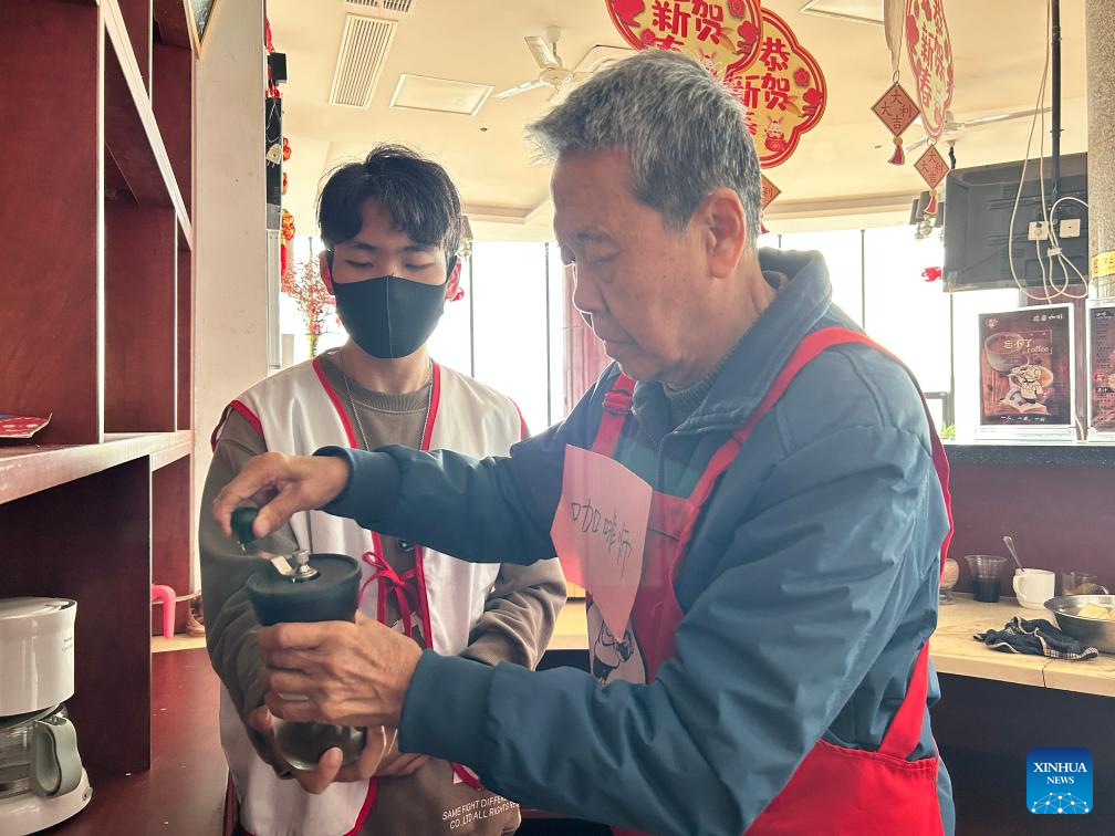 A senior citizen with cognitive disorder makes coffee like a barista under the guidance of a social worker at Hetong Cognitive Rehabilitation Center in north China's Tianjin April 17, 2023. (Xinhua)