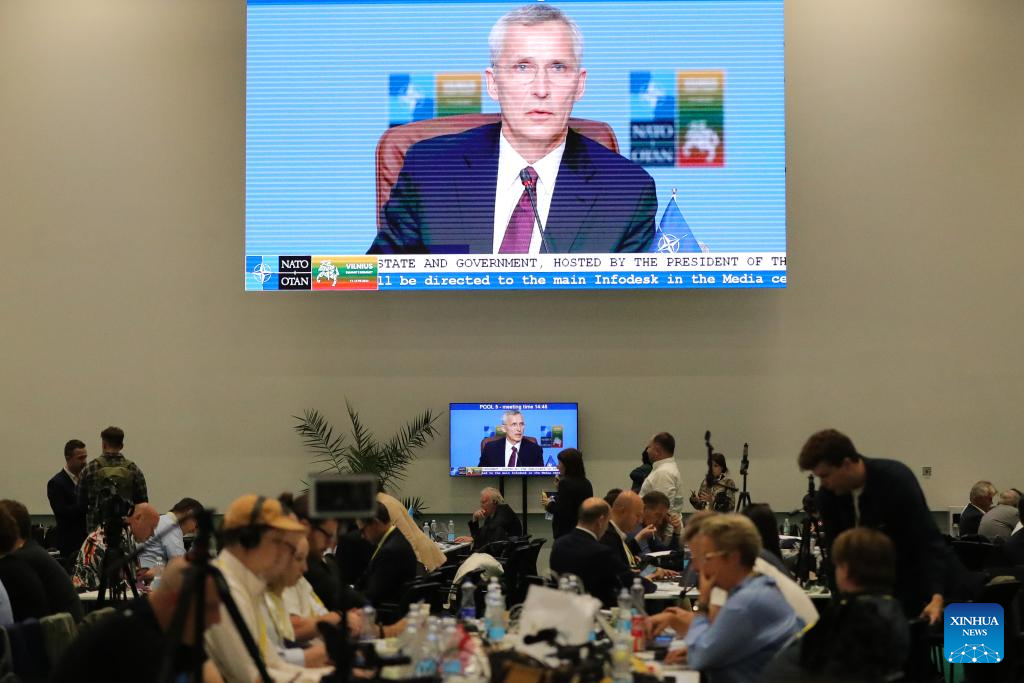 A screen at the media center of the NATO summit shows NATO Secretary-General Jens Stoltenberg presiding over the summit in Vilnius, Lithuania, July 11, 2023. (Xinhua/Zheng Huansong)