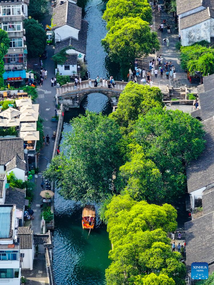 This aerial photo taken on July 3, 2023 shows a view of a historic and cultural block of Pingjiang Road in Suzhou, east China's Jiangsu Province. Suzhou, a city with a history of over 2,500 years, is referred to as heaven on earth in a famous Chinese adage. (Xinhua/Li Bo)