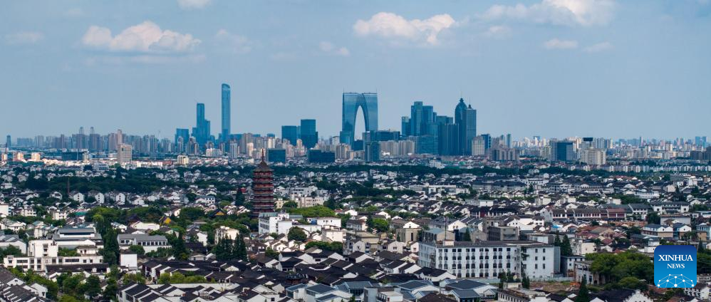This aerial photo taken on July 4, 2023 shows a view by the Jinji Lake in Suzhou, east China's Jiangsu Province. Suzhou, a city with a history of over 2,500 years, is referred to as heaven on earth in a famous Chinese adage. (Xinhua/Li Bo)