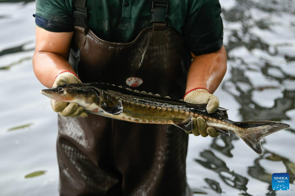 Zhou Liang checks juvenile fish of Yangtze sturgeon at a breeding base jointly operated by Yibin Institute of Rare Aquatic Animals and Fisheries Institute of Sichuan Academy of Agricultural Sciences in Yibin, southwest China's Sichuan Province, June 27, 2023. (Xinhua/Wang Xi)