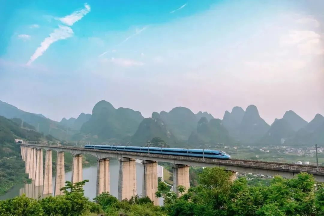 The bridge over the Xingfuyuan reservoir, which the train was passing through in the video, is located 1.5 kilometers southeast of the Yangshuo high-speed railway station. It offers views of rolling mountains and turquoise waters.