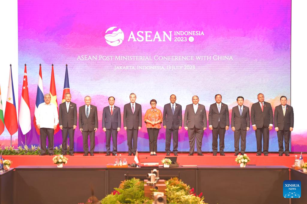 Director of the Office of the Central Commission for Foreign Affairs Wang Yi (5th L) attends the ASEAN-China Foreign Ministers' Meeting in Jakarta, Indonesia, on July 13, 2023. (Xinhua/Xu Qin)