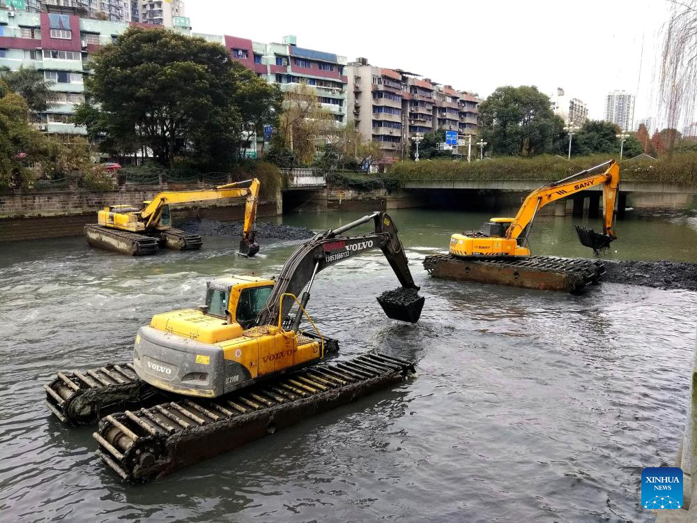 Excavators clean mud in the Fuhe River in Chengdu, capital of southwest China's Sichuan Province, Jan. 25, 2018. (Photo by Cao Zongming/Xinhua)