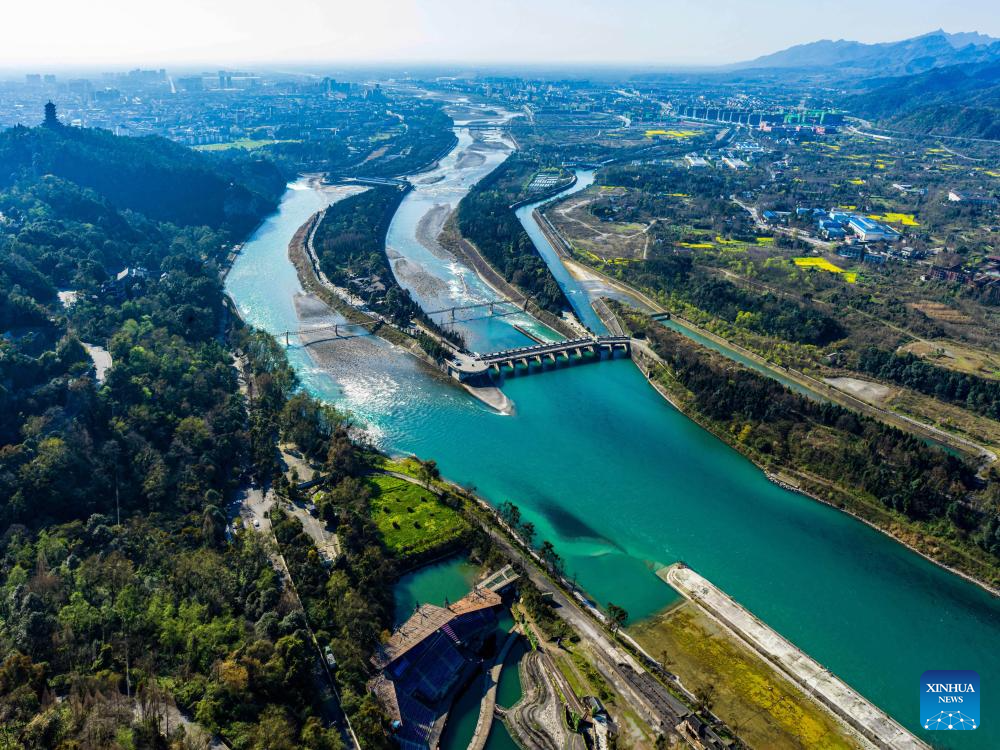 This aerial photo taken on March 4, 2023 shows the Dujiangyan irrigation system where the Jinjiang River starts in Chengdu, capital of southwest China's Sichuan Province. (Photo by Wang Qi/Xinhua)