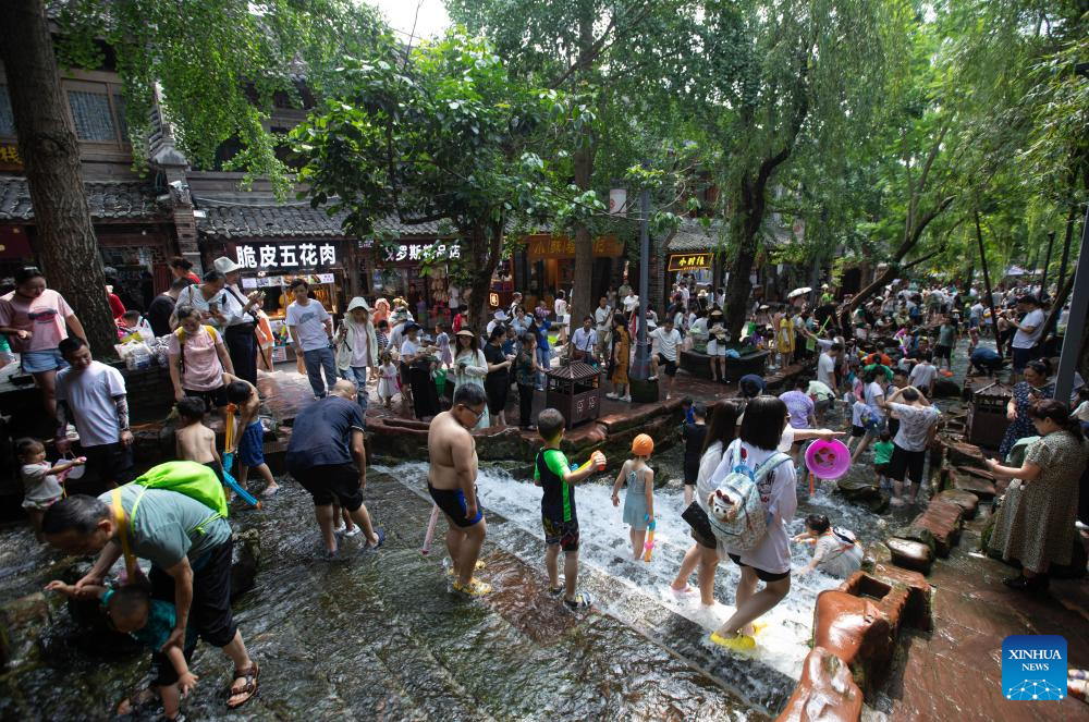 Children have fun at the Huanglong creek ancient town in Chengdu, capital of southwest China's Sichuan Province, June 24, 2023. (Xinhua/Jiang Hongjing)