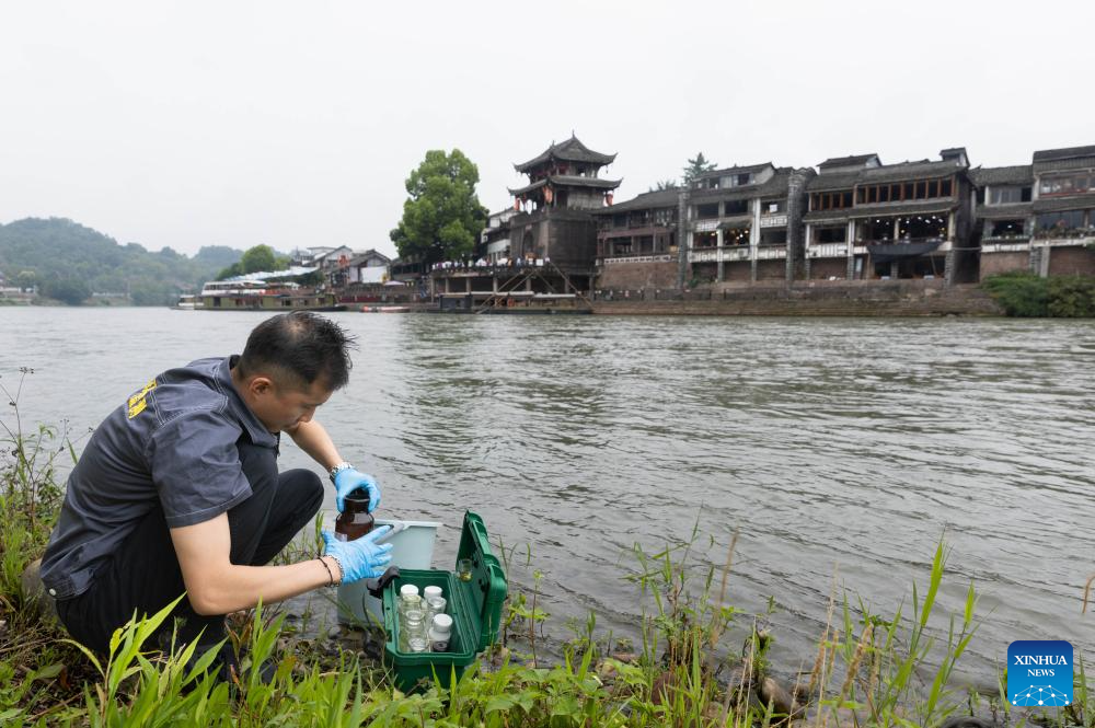 A worker collects water for quality test from the Jinjiang River in Chengdu, capital of southwest China's Sichuan Province, June 15, 2023. (Xinhua/Jiang Hongjing)