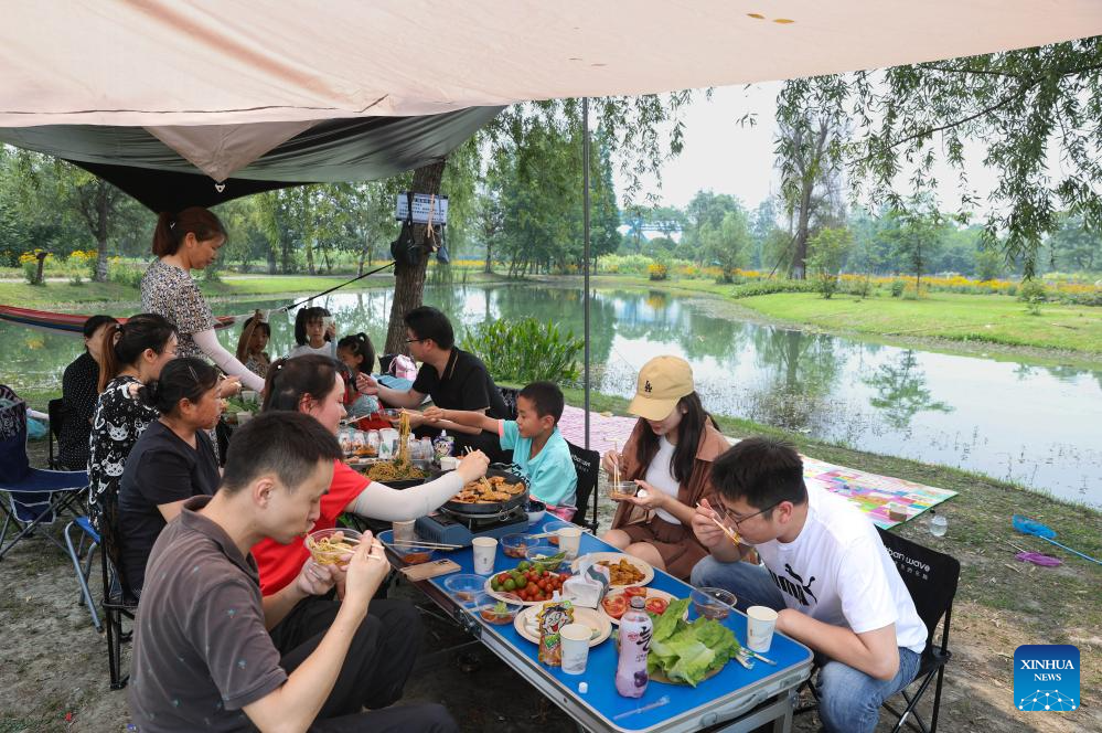 People enjoy family camping at the Xuyan river wetland park in Chengdu, capital of southwest China's Sichuan Province, June 23, 2023. (Xinhua/Jiang Hongjing)