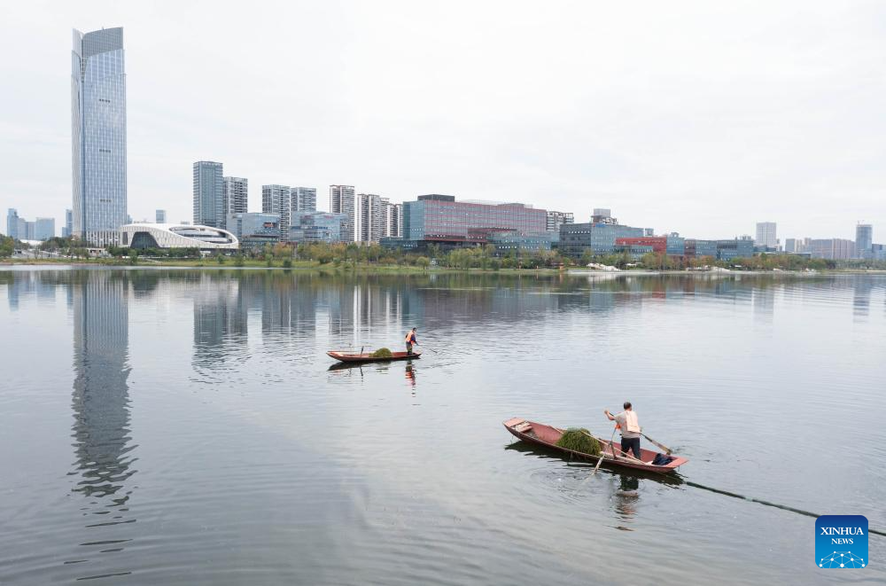 Workers collect water plants on the Xinglong lake in Tianfu new area, southwest China's Sichuan Province, Sept. 21, 2022. (Xinhua/Jiang Hongjing)